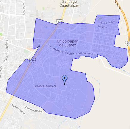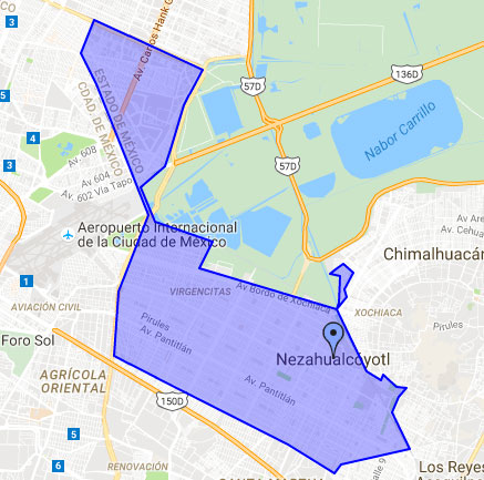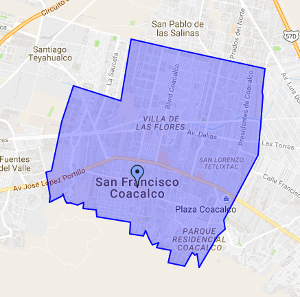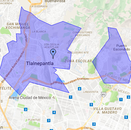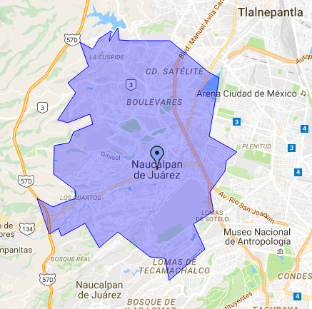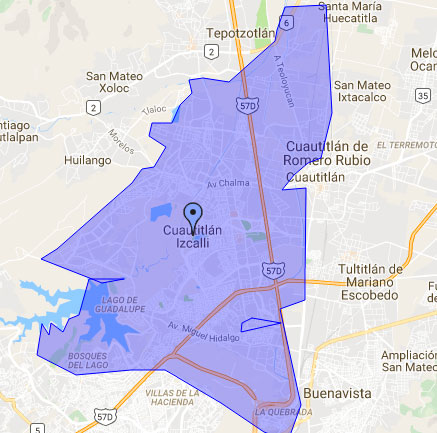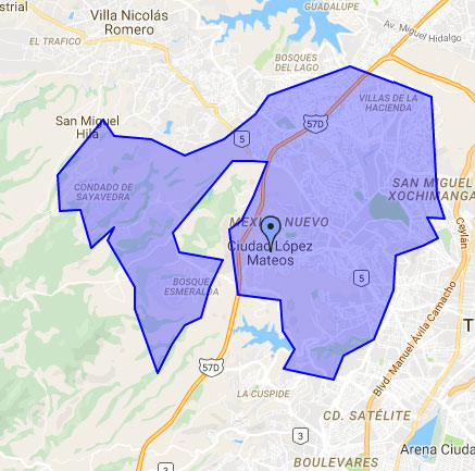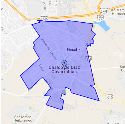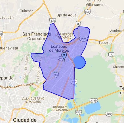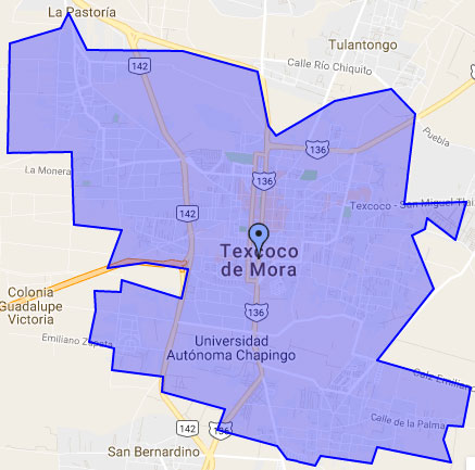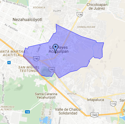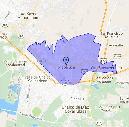 Acolman Álvaro Obregón Amecameca de Juárez Azcapotzalco Benito Juárez Chalco de Díaz Covarrubias Ciudad López Mateos Ciudad Nicolás Romero Coyoacán Cuajimalpa de Morelos Cuauhtémoc Cuautitlán Izcalli Ecatepec de Morelos Ejido de Chicoloapan Gustavo A. Madero Huixquilucan de Degollado Ixtapaluca Iztacalco Iztapalapa Los Reyes Magdalena Contreras Miguel Hidalgo Milpa Alta Naucalpan de Juárez Nezahualcóyotl Ozumba San Francisco Coacalco Teotihuacán Tepotzotlán Texcoco de Mora Tláhuac Tlalmanalco Tlalnepantla de Baz Tlalpan Tultitlán de Mariano Escobedo Venustiano Carranza Xochimilco